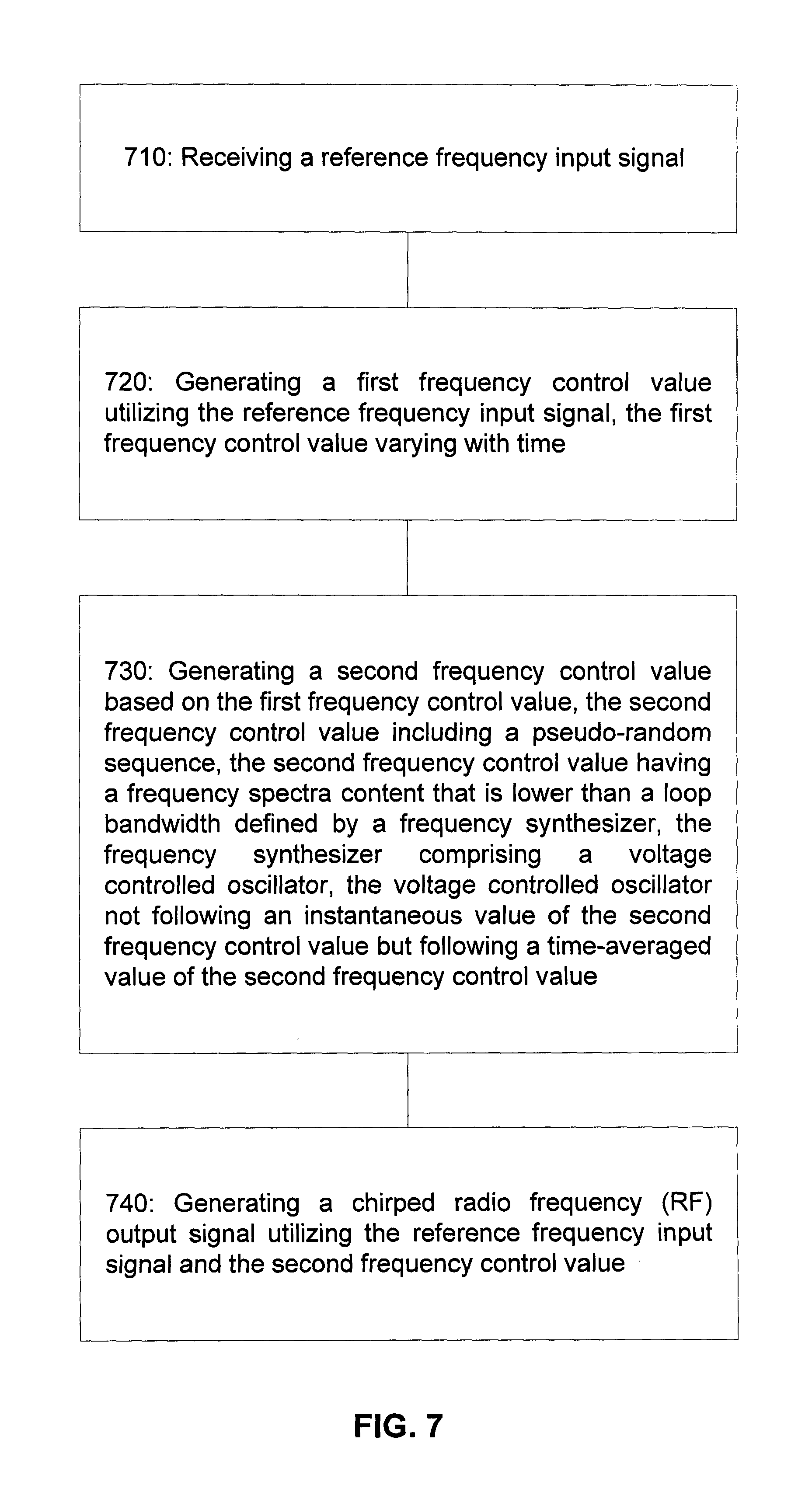 The method further comprises generating a second frequency control value based on the first frequency control value (730). The second frequency control value includes a pseudo-random sequence. The second frequency control value has a frequency spectra content that is higher than a loop bandwidth defined by a frequency synthesizer. The frequency synthesizer comprises a voltage controlled oscillator. The voltage controlled oscillator does not follow an instantaneous value of the second frequency control value but rather follows a time-averaged value of the second frequency control value. The method further comprises generating a chirped radio frequency (RF) output signal utilizing the reference frequency input signal and the second frequency control value (740).
