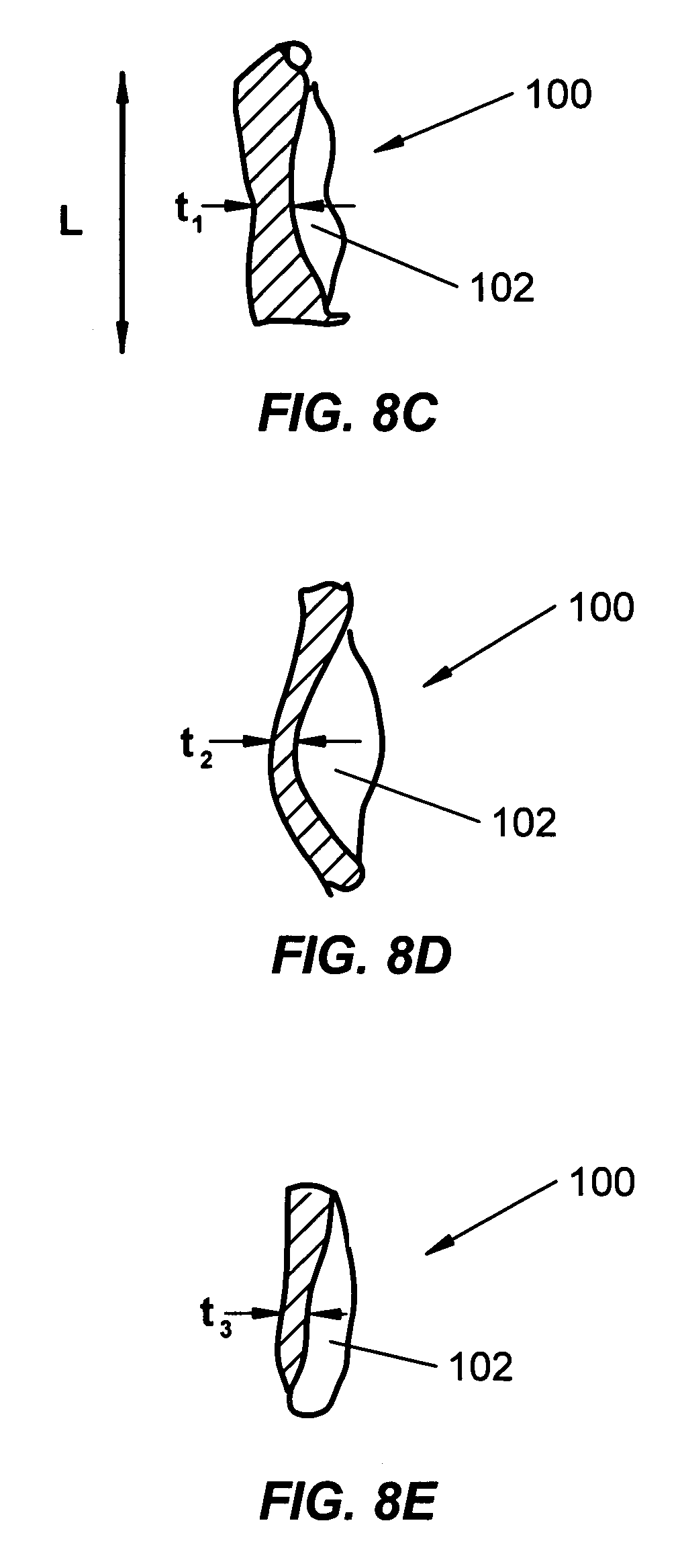 The implant, or any component thereof, can have a variety of shapes such that the periphery of the implant can be of greater thickness than a central portion of the implant. Alternatively, the implant, or any component thereof, can be designed so that the central portion of the implant is of greater thickness than a periphery. Looking at the implant from a plurality of directions, such as an anterior portion, posterior portion, lateral portion and medial portion, the implant, or any component thereof, can have a thickness along the posterior portion of the device that is equal to or greater than a thickness of at least one of the lateral, medial and anterior portion of the implant. Alternatively, the implant, or any component thereof, can have a thickness along a posterior portion of the device that is equal to or less than a thickness of at least one of the lateral, medial and anterior portion of the implant. In yet another alternative, the implant, or any component thereof, can have a thickness along a medial portion of the device that is equal to or less than a thickness of at least one of an anterior portion, posterior portion, and lateral portion. In another alternative, the implant can have a thickness along a medial portion of the device that is equal to or greater than a thickness of at least one of an anterior portion, posterior portion, and lateral portion.