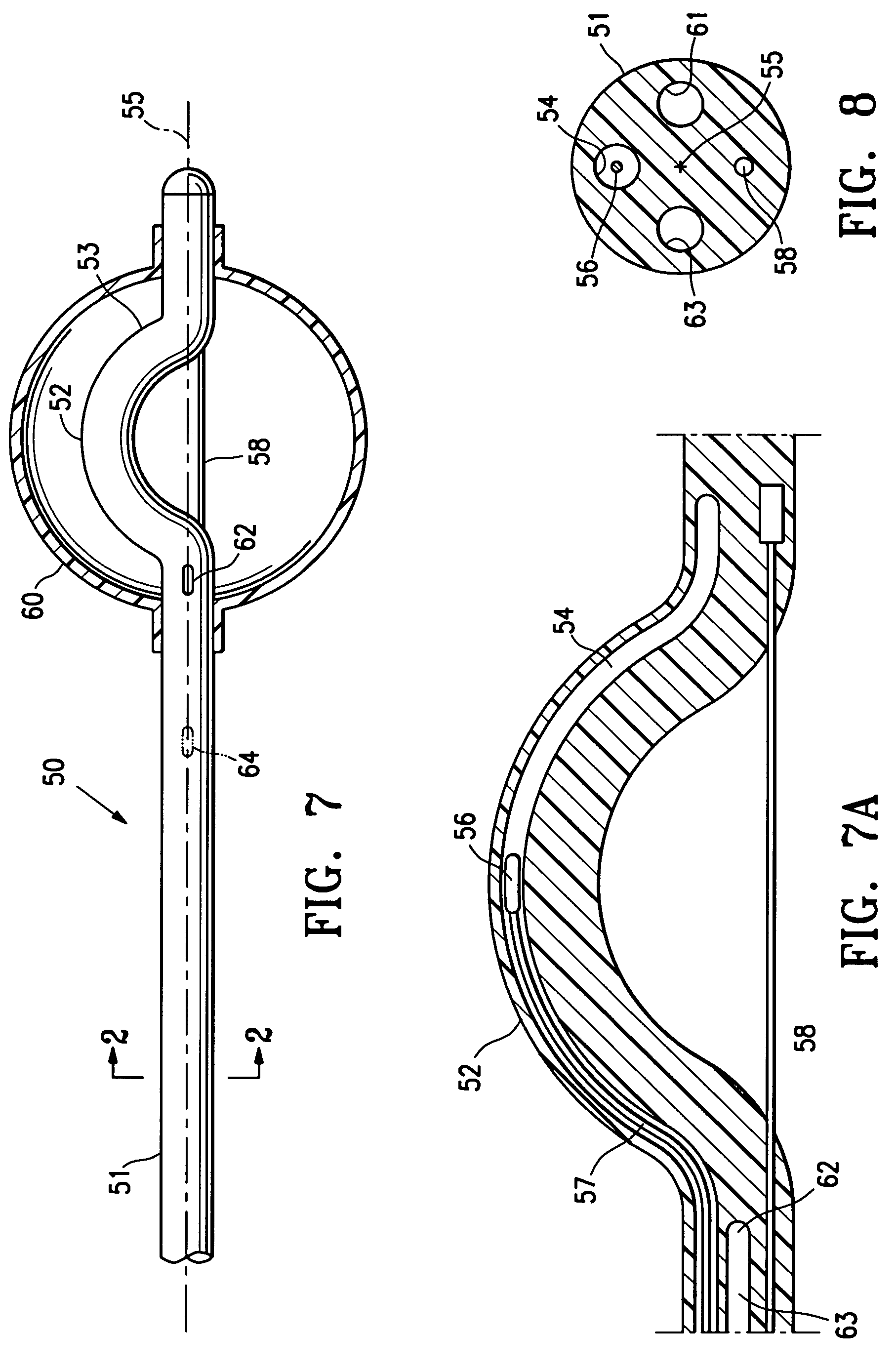 All of the radiation delivery tubes which extend through the interior of the balloon 142 would not necessarily be used in a procedure and in fact would probable not be used. However, they would be available for use by the physician if needed, e.g. when the catheter is not in a desired position and rotation of the catheter is not appropriate or desirable. The shaft 141 is shown as a solid shaft having a plurality of passageways. However, the shaft 141 may be made more flexible by utilizing a plurality of tubes which are bundled together form the shaft as shown in