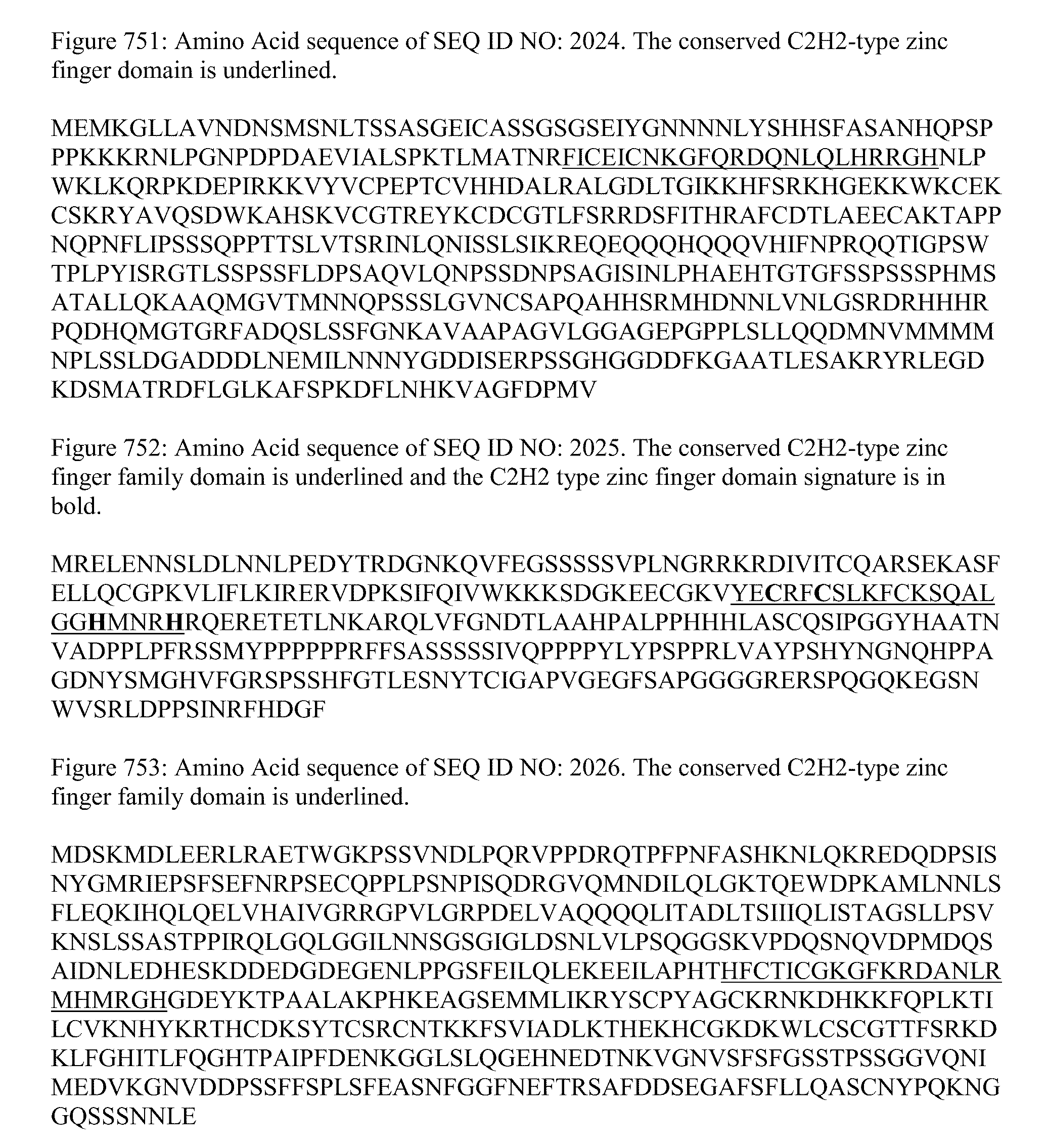 Several transcription factor families have been identified in plants. For example, nucleotide sequences encoding the following transcription factors families have been identified: Alfin-like, AP2 (APETALA2) and EREBPs (ethylene-responsive element binding proteins), ARF, AUX/IAA, bHLH, bZIP, C2C2 (Zn), C2C2 (Co-like), C2C2 (Dof), C2C2 (GATA), C2C2 (YABBY), C2H2 (Zn), C3H-type, CCAAT, CCAAT HAP3, CCAAT HAP5, CPP (Zn), DRAP1, E2F/DP, GARP, GRAS, HMG-BOX, HOMEO BOX, HSF, Jumanji, LFY, LIM, MADS Box (SEQ ID NO: 3668), MYB, NAC, NIN-like, Polycomb-like, RAV-like, SBP, TCP, TFIID, Transfactor, Trihelix, TUBBY, and WRKY (SEQ ID NO: 3670).