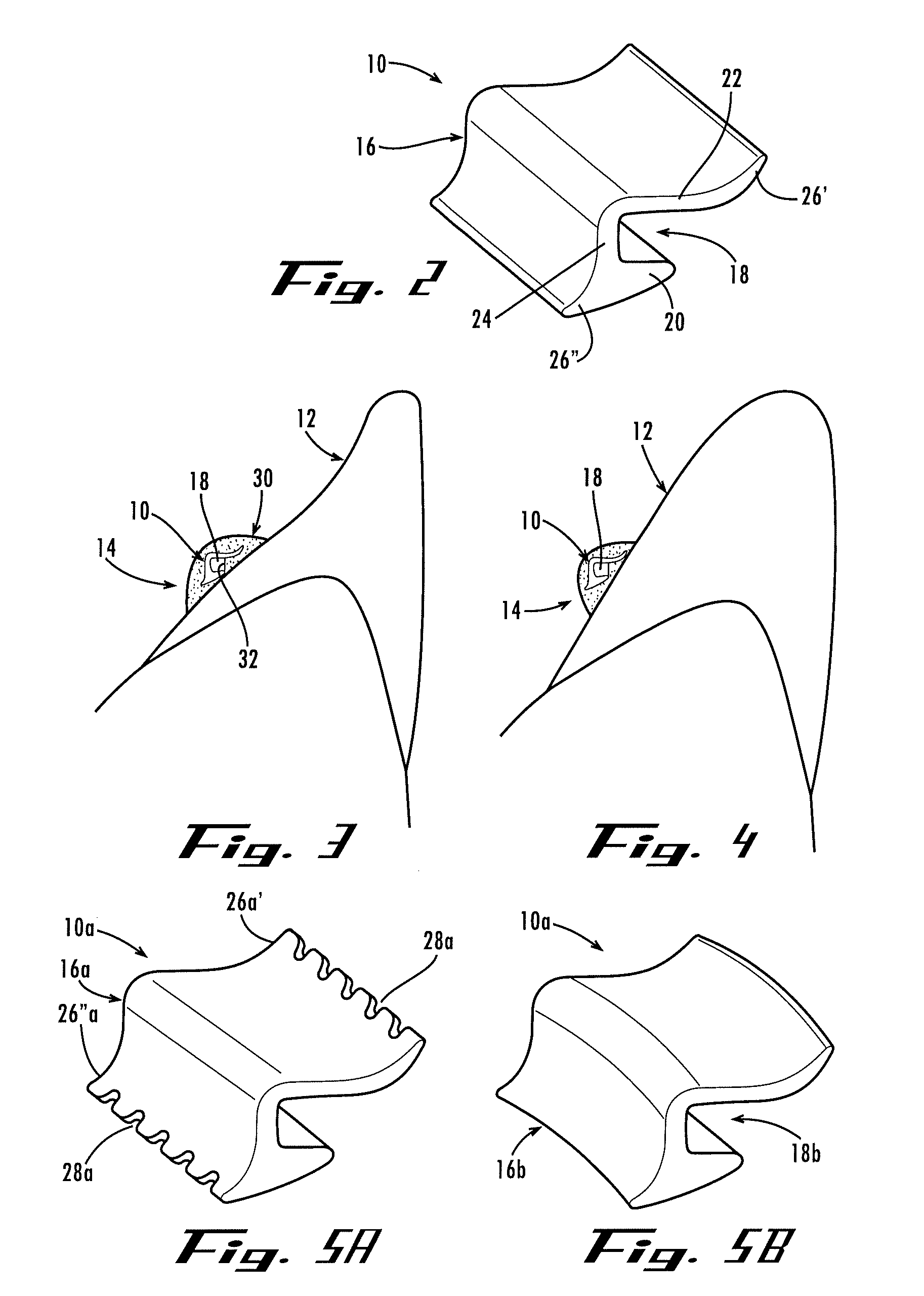 Preferably, the adhesive mass 30 encapsulates the bracket 10, except for the opening 18. In this configuration, the attachment 14 has a nice, smooth, continuous outer surface where the tongue and/cheeks might rub against it. Alternatively, the bracket 10 can be embedded in the adhesive mass 30, but not encapsulated, so that a portion of the body 16 remains exposed. In this configuration, the width of the attachment 14 is minimized. In any case, when using a bracket 10 with a slotted opening 18, the adhesive mass 30 defines a fourth wall of the opening.