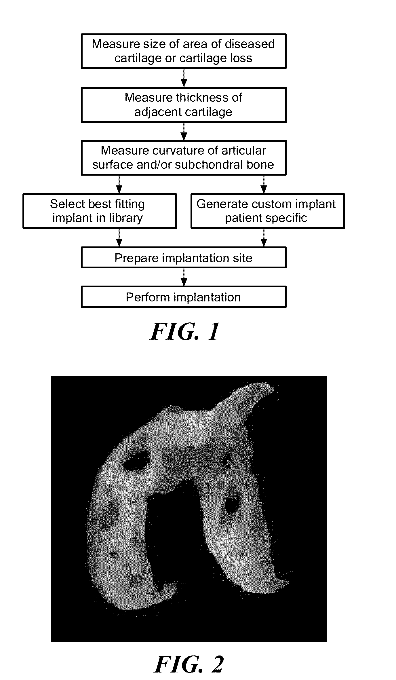 In other embodiments, the curvature of the articular surface can be measured to design and/or shape the repair material. Further, both the thickness of the remaining cartilage and the curvature of the articular surface can be measured to design and/or shape the repair material. Alternatively, the curvature of the subchondral bone can be measured and the resultant measurement(s) can be used to either select or shape a cartilage replacement material.