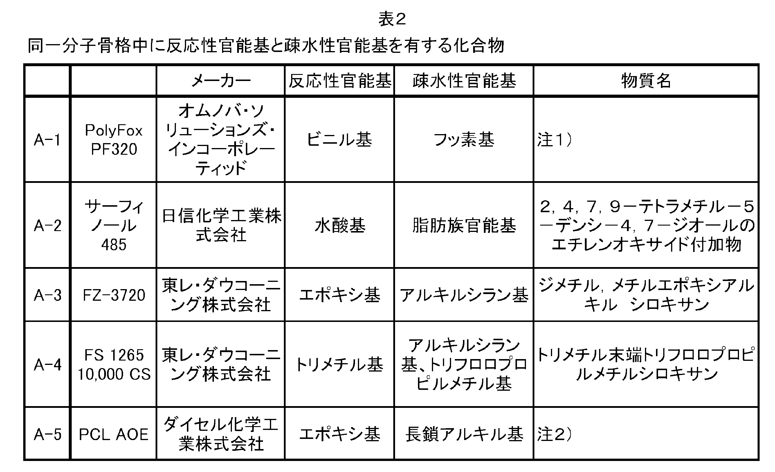 同一分子骨格中に反応性官能基と疎水性官能基を有する化合物:表2に示す。 Compounds having a reactive functional group and a hydrophobic functional group in the same molecular skeleton: I shown in Table 2.