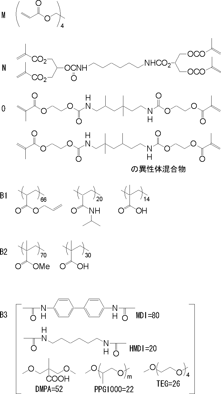 表8中、「付加重合性化合物」欄におけるM、N、O、及び、「バインダーポリマー」欄におけるB1、B2、B3の詳細は、下記のとおりである。 In Table 8, M in the "addition polymerizable compound" column, N, O, and details of the B1, B2, B3 in a "binder polymer" column are as follows. なお、下記B3は、MDI/HMDIの共重合体〔モル比80/20〕と、下記構造のDMPAとPPG(m=3)とTEGとの共重合体〔モル比52/22/26〕との混合物である〔混合比50/50(モル比)〕。 Incidentally, the following B3 is a copolymer of MDI / HMDI [molar ratio 80/20], DMPA and PPG (m = 3) and the copolymer of TEG the following structure and the molar ratio [52/22/26] It is a mixture of [mixing ratio of 50/50 (molar ratio)].