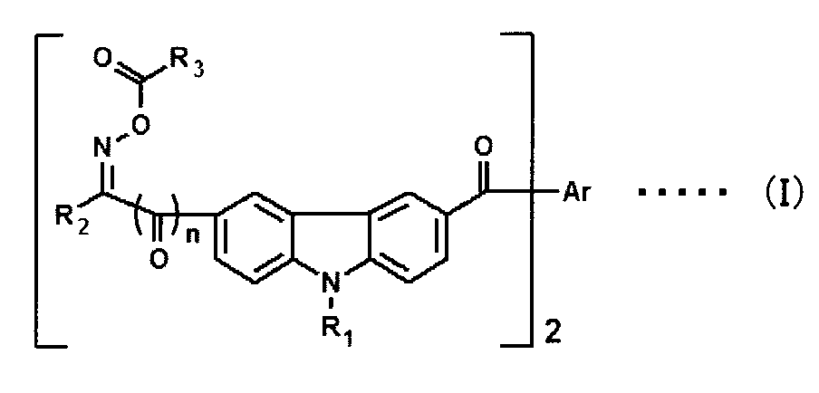 このようなオキシムエステル化合物を用いることにより、さらに揮発が低減され、アウトガスによる汚染を抑えることが可能となる。 The use of such oxime ester compounds, and further volatilization is reduced, it becomes possible to suppress the contamination due to outgassing. これは、光照射によるラジカル発生(光解裂)箇所が、オキシムエステル基であり、残りのカルバゾール2量体は、従来の光重合開始剤と比べて分子量の大きな化合物であるためと考えられる。 This is a radical generated by light irradiation (light cleavage) location is an oxime ester group and the remainder of the carbazole dimer is considered because it is a large compound having a molecular weight as compared to conventional photoinitiators. さらに、一般式(I)中、R 1 、R 2が、それぞれ、メチル基またはエチル基であり、R 3はメチルまたはフェニルであり、Arは、結合か、フェニレン、ナフチレンまたはチエニレン、nは0であることが好ましい。 Furthermore, in the general formula (I), R 1, R 2 are each a methyl group or an ethyl group, R 3 is methyl or phenyl, Ar is a bond or phenylene, naphthylene or thienylene, n is 0 It is preferably not.