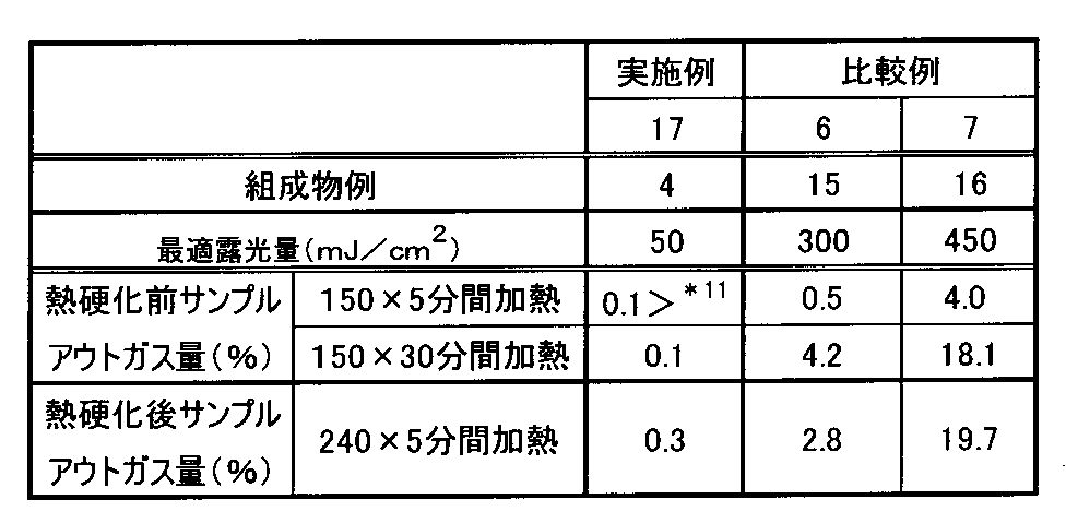 表1の組成物例4、15、16の光硬化性樹脂組成物を実施例17、比較例6、7とし、ガラス基板上にスクリーン印刷により塗布し、熱風循環式乾燥炉を用いて80℃で30分間乾燥した後、オーク製作所社製高圧水銀灯露光装置を用いて、適正露光量で露光した。 The photocurable resin composition of Example 17 Composition Example 4,15,16 in Table 1, and as Comparative Examples 6 and 7 was applied by screen printing on a glass substrate, 80 ℃ using a hot-air circulating drying oven in After drying for 30 minutes, using ORC Manufacturing Co., Ltd. high-pressure mercury lamp exposure apparatus, and exposure with appropriate exposure amount. そして、その一部について、そのまま塗膜を削りだし、熱硬化前サンプルとし、残りを150℃で60分間硬化した後、塗膜を削りだし熱硬化後サンプルとした。 Then, for its part, as it is shaving a coating film and a thermally cured samples before and after curing for 60 minutes at 150 ℃ the rest, to obtain a heat-cured after the sample shaving the coating. それぞれのサンプル1mgを、パージ&トラップにて、熱硬化前サンプルは150℃で5分間および150℃で30分間、熱硬化後サンプルは245℃で5分間加熱し、発生した光重合開始剤成分を、ガスクロマトグラフで定量した。 Each sample 1mg, in purge and trap, thermal curing before samples at 150 ℃ 5 minutes and 150 ℃ for 30 minutes, after thermal curing sample was heated for 5 minutes at 245 ℃, the light polymerization initiator component generated , it was quantified by gas chromatograph. このときの適正露光量と、発生した光重合開始剤由来の揮発成分(アウトガス)の定量結果を表4に示す。 I shows a correct exposure amount at this time, the quantitative results of the volatile component from the generated photoinitiator (out gas) in Table 4.