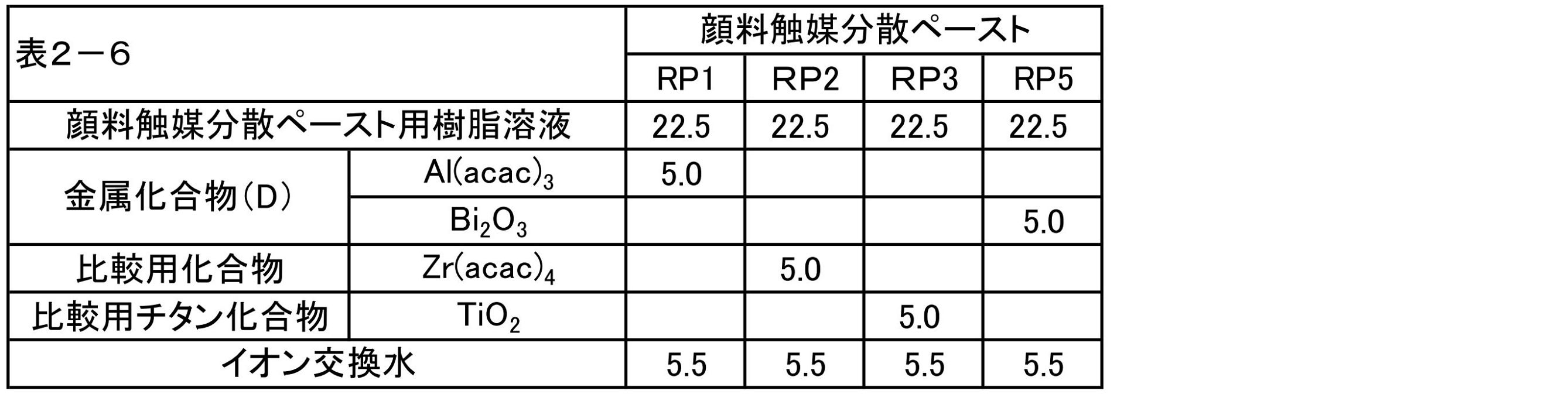 本発明のチタン化合物の代わりに、トリス(2,4-ペンタジオナト)アルミニウム(III)5.0gを使用して製造例P1と同様の方法で顔料触媒分散ペーストRP1を得た。 Instead of the titanium compound of the present invention, to obtain a pigment dispersion paste catalyst RP1 tris (2,4 Pentajionato) aluminum (III) using 5.0g same manner as in Preparation Example P1.